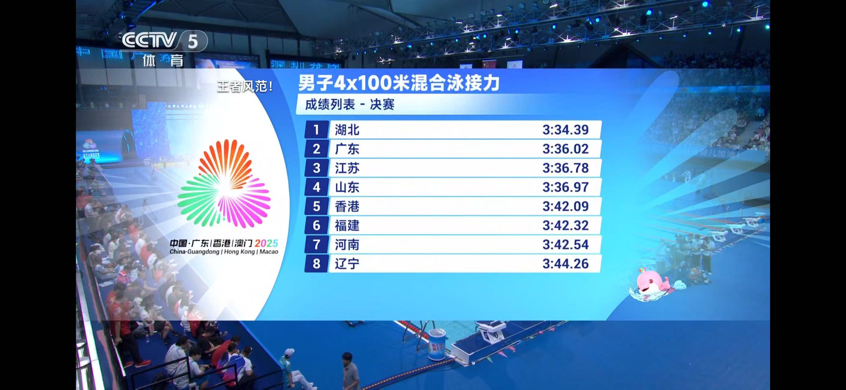 11月17日,第十五届全运会游泳项目迎来收官之战。在男子4x100米混合泳接力决赛中,湖北队凭借以3分34秒39的成绩摘得金牌,广东队、江苏队分获二、三名。比赛竞争激烈,第二名至第四名成绩相差不足一秒。